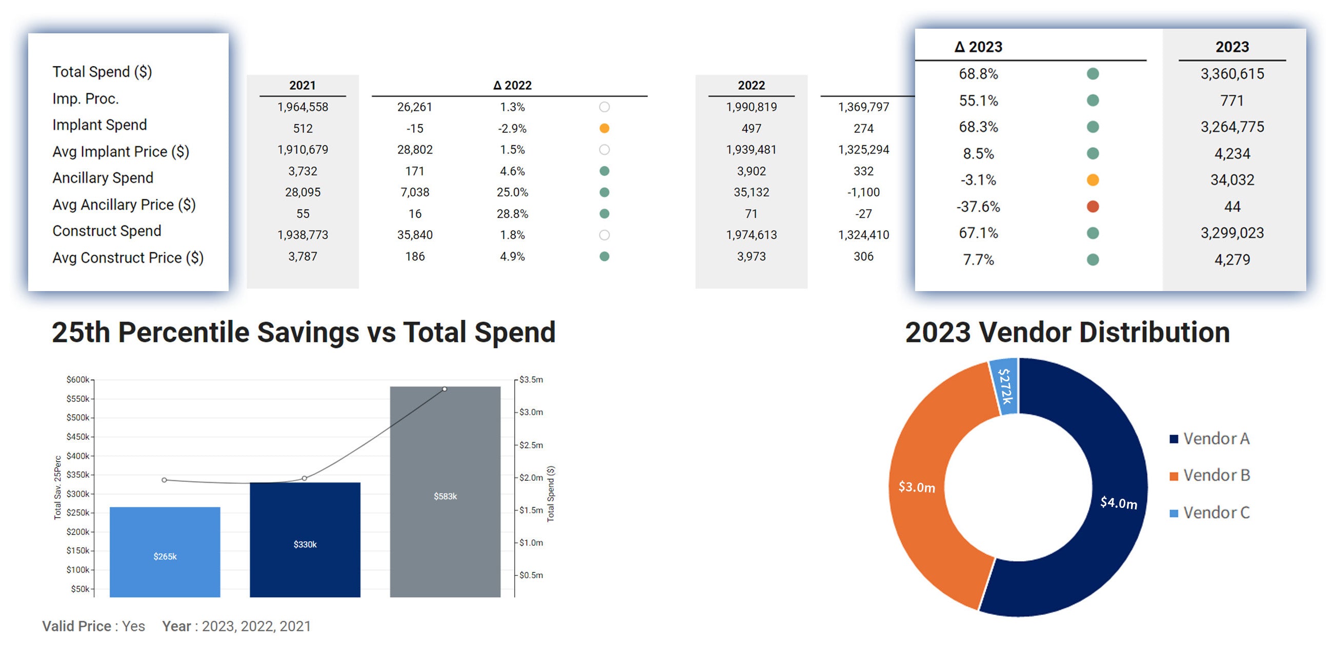 We provide insights from multiple levels including summary, construct (combining hundreds of component variations that make up a primary hip or knee), and detailed component and ancillary products. The AI-powered platform provides comprehensive reports of savings opportunities derived from price benchmarking, utilization and variation based on preference, and standardization opportunities.